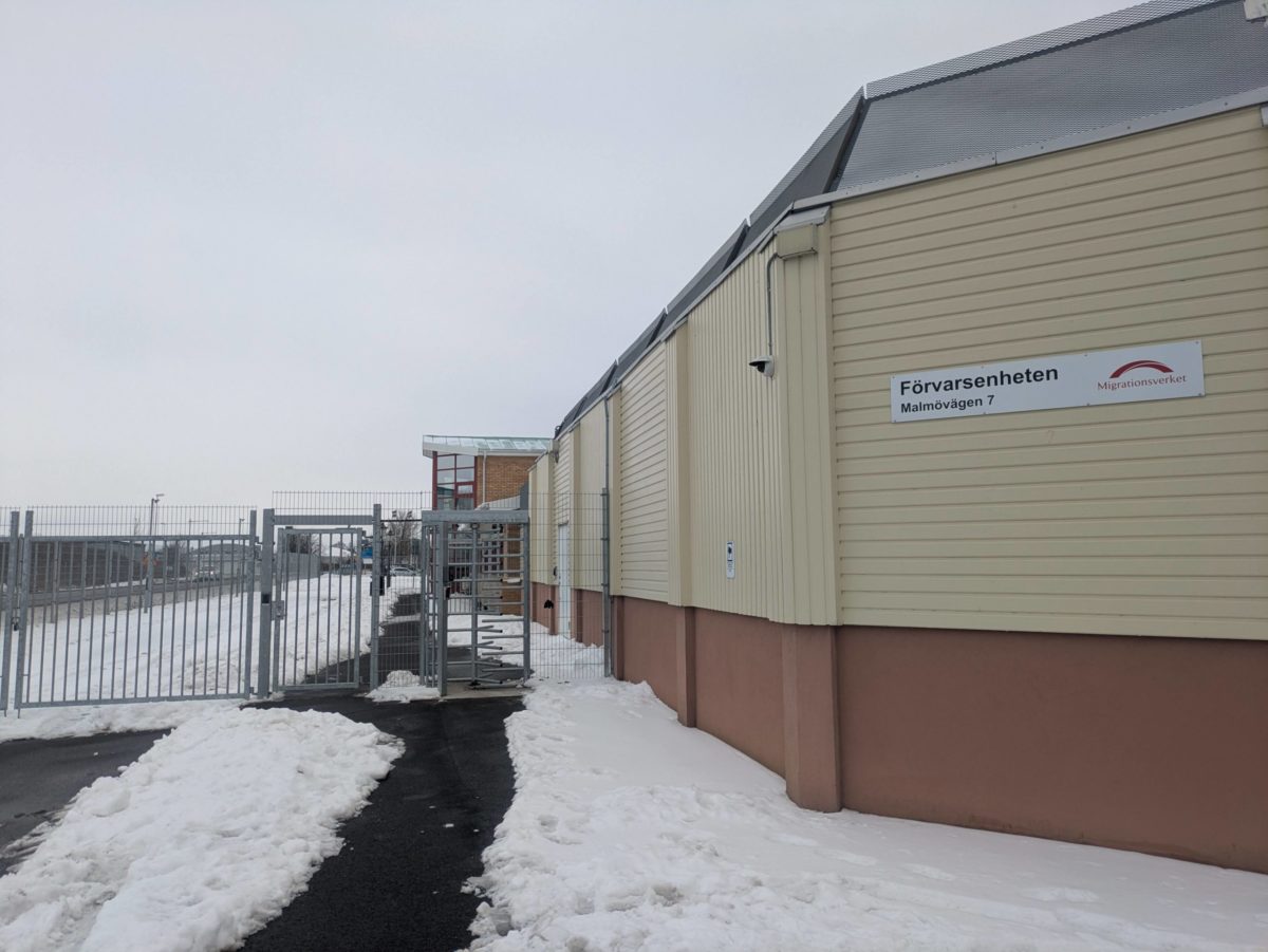 A prison service van pulls up outside as we come up to a rotating security door at the Migration Agency's detention facility at Åstorp, southern Sweden.